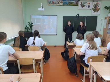 Заместитель начальника территориального Отдела майор полиции Денис Зудерман и инспектор ГРЛС майор полиции Елена Павленко посетили Семикаракорскую среднюю школу № 3 и провели урок «Разговоры о важном» с учащимися «Полицейского класса» 8 «А».