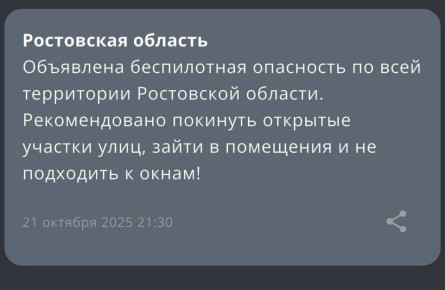 21.10.2025, 21:57 Опасность БПЛА объявлена в Ростовской области, — местные ТГ-каналы// Украина.ру