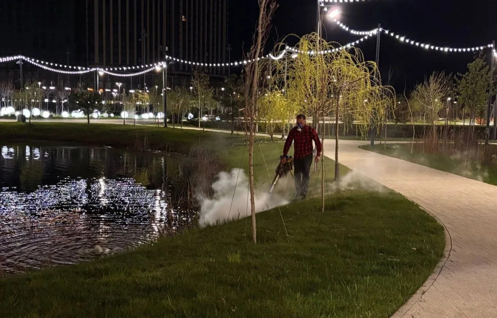 Работы проводились с применением современных сертифицированных препаратов. Особое внимание уделялось местам массового пребывания людей: аллеям, пешеходным дорожкам, зонам вокруг детских и спортивных площадок, аттракционов.