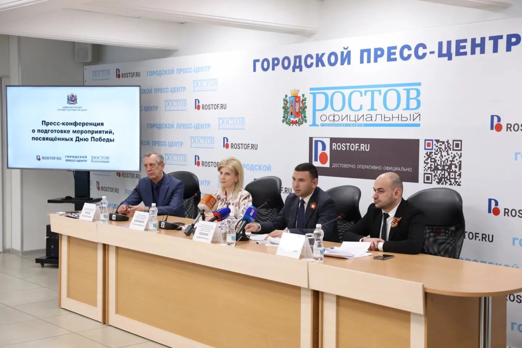 В городском пресс-центре прошла пресс-конференция, посвященная празднованию Дня Победы в Ростове. Участие в ней приняли и.о. заместителя главы Администрации города по социальным вопросам Андрей Косенко, директор Департамента социальной защиты населения города Виктория Добрицкая и заместитель начальника Управления культуры города Степан Сирунян.