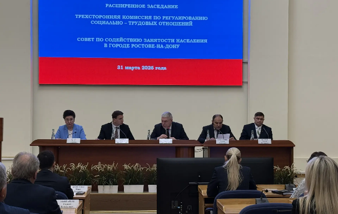 01.04.2026, /=РО=/31 марта 2026 года в администрации города Ростова-на-Дону под председательством заместителя главы администрации по экономике Виталия Золотухина состоялось расширенное заседание трехсторонней комиссии по регулированию социально-трудовых отношений и Совета по содействию занятости населения. Об этом сообщает пресс-служба администрации города.