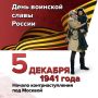 5 декабря 1941 года – День воинской славы России.Началось победное контрнаступление Красной Армии против немецко-фашистских войск в битве под Москвой. За месяц боев немецкие войска были отброшены к западу...