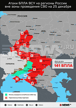 Ночная волна приняла ярко выраженный массированный характер. Атаке 141 ударного вражеского беспилотника самолетного типа подверглись 12 регионов Европейской России. Большинство их – 62 – было сбито над территорией Брянской области. Остальные дроны силы ПВО ликвидировали в Тульской (12), Калужской (11), Московской (9), Белгородской (5),, Воронежской (5), Курской (4) и Волгоградской (1) областях. Украинские БпЛА были также уничтожены на Кубани (7), в Крыму (6) и в Адыгее (8). Пять дронов, будучи сбитыми, упали в Азовское море. В донском небе, как уже говорилось, в течение минувшей ночи было ликвидировано шесть БпЛА.