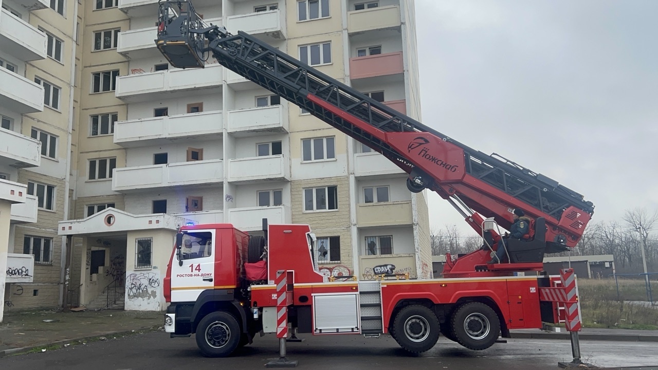 На вооружение ростовских пожарных поступила новая техника. Это единственный на Дону автомобиль, снабжённый автоматической лестницей, способной выдвигаться на 52 метра.