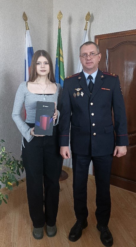 Начальник отдела, полковник полиции Петр Николаевич Жигалов, лично вручил девушке умную колонку «Алису». Этот подарок позволит Веронике слушать музыку, узнавать новое о творчестве с помощью голосового помощника.