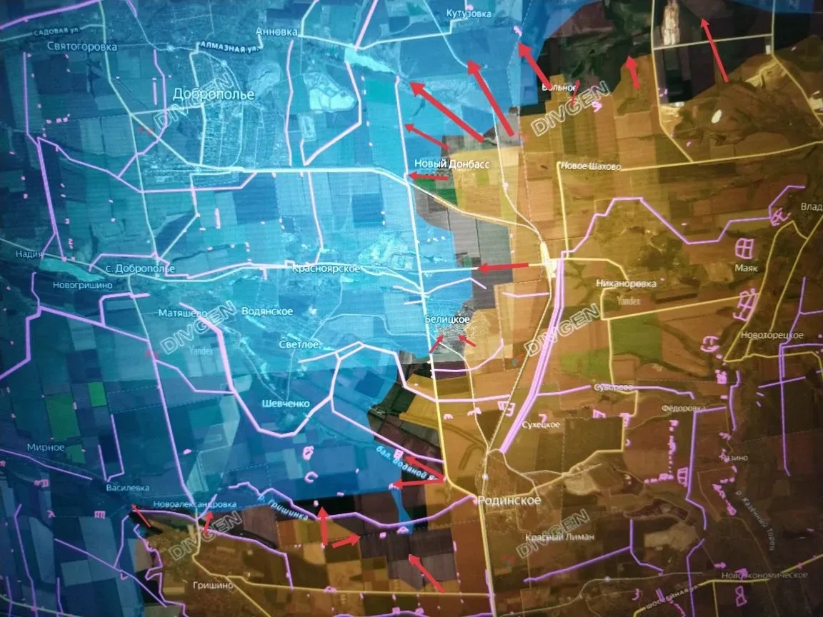 Западнее Родинского под контроль ВС РФ перешла шахта Запорожская, восточная часть балки Водяной Яр, наши воины продвинулись в направлении высоты с отм. 195,1 по посадке от шахты и с юга, в районе балки Третий Яр (восточнее Новоалександровки).
