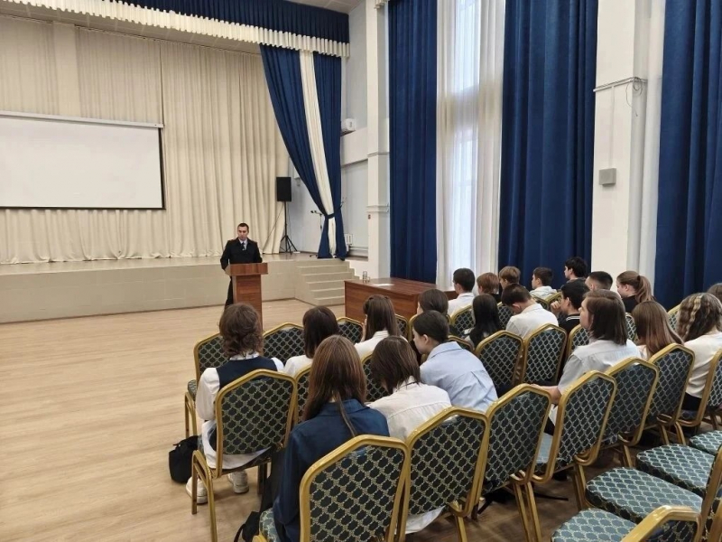 Сотрудники отдела МВД России по городу Донецку - начальник Следственного отдела капитан юстиции Алан Бигаев и начальник отдела уголовного майор полиции Виктор Негода провели профилактическую встречу с учениками 9-10 классов школы № 18.
