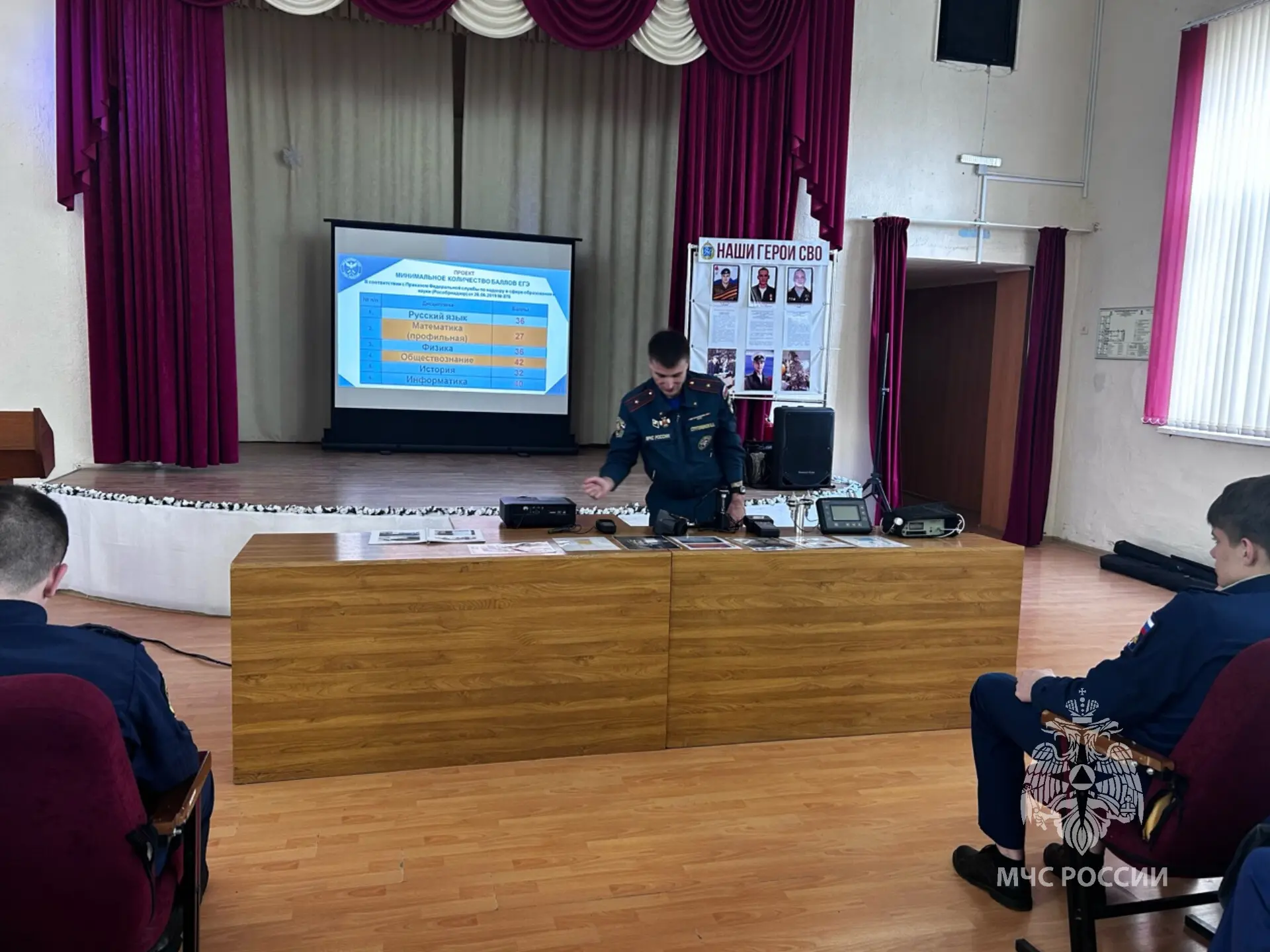 Сотрудники испытательной пожарной лаборатории Ростовской области посетили Неклиновскую школу-интернат с первоначальной лётной подготовкой им. 4-ой Краснознамённой Воздушной Армии в рамках кампании по подбору кандидатов на обучение в вузах МЧС России.