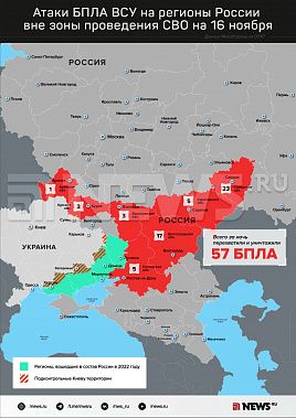 В течение прошедшей ночи в период с 23:00 мск 15 ноября до 7:00 16 ноября дежурными средствами ПВО перехвачены и уничтожены 57 украинских беспилотных летательных аппаратов самолетного типа:23 – над территорией Самарской...