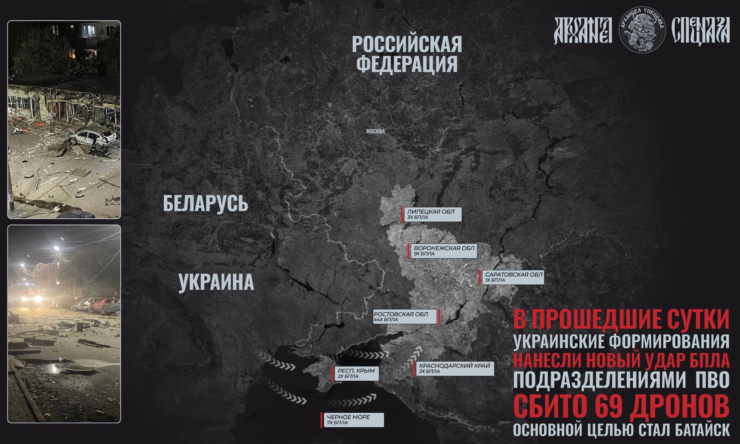 Прошедшей ночью украинская сторона нанесла новый удар беспилотниками. Основные волны дронов были зафиксированы над Ростовской областью.