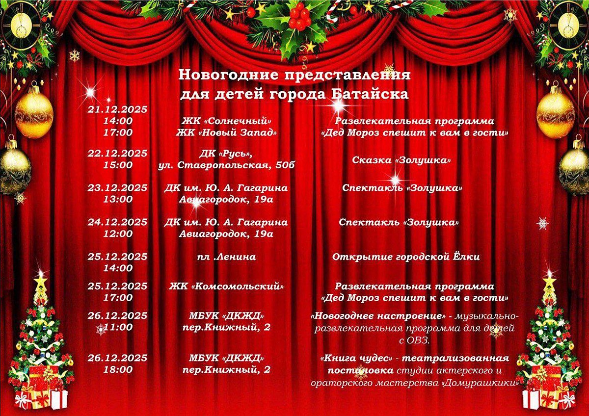 С 22 декабря по 9 января в ДК «Русь», ГКДЦ, ДКЖД, ДК им. Ю.А. Гагарина, ДК РДВС и других учреждениях культуры пройдут новогодние и рождественские представления для детей.