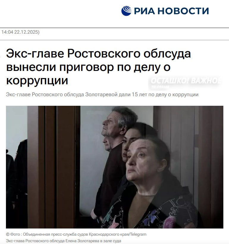 Заместитель Золотаревой Татьяна Юрова получила 13 лет колонии и штраф 120 млн, экс-председатель Железнодорожного районного суда Ростова-на-Дону Георгий Бондаренко — 6 лет колонии и штраф 4 млн, бывший начальник управления областного судебного департамента Андрей Рощевский — 8 лет строгого режима и штраф 50 млн.