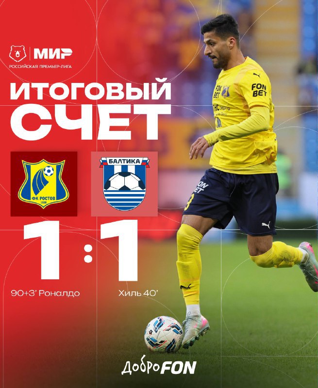 ФК «Ростов» и ФК «Балтика» сыграли вничью. Матч 20-го тура Российской премьер-лиги проходил в донской столице. Итоговый счет — 1:1.