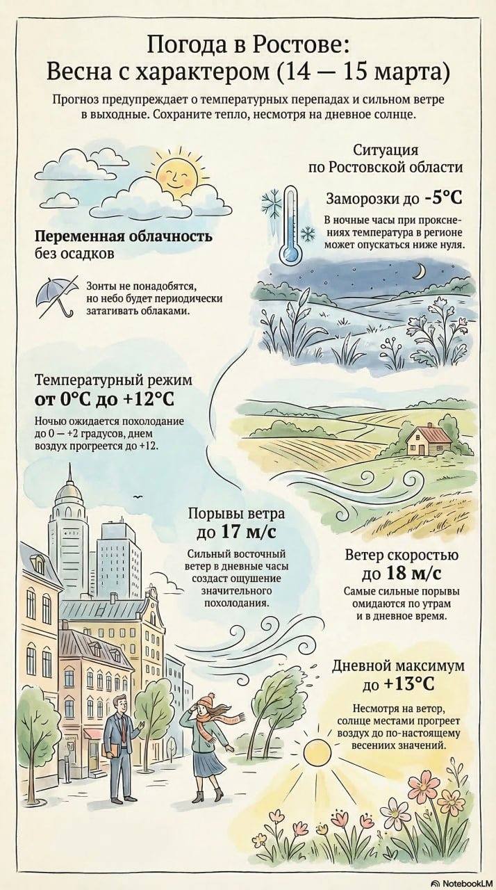 Многие ростовчане после +15 градусов в будние дни спрятали подальше теплые куртки, но, возможно, поторопились. Погода в Ростове-на-Дону и области в выходные 14 — 15 марта станет немного прохладнее по сравнению с прошедшей рабочей неделей.