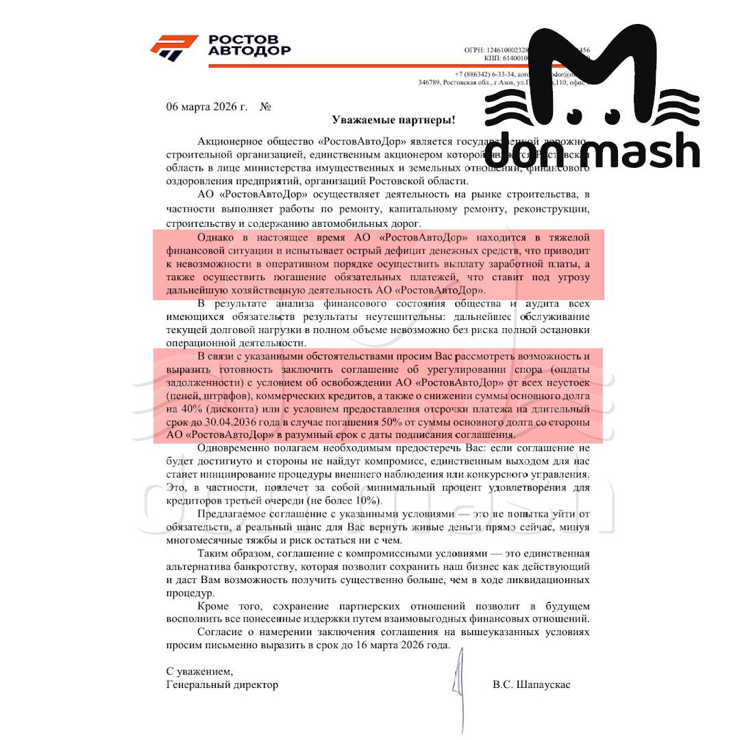 В Don Mash обратился поставщик деталей, который уже год не может выбить 44 млн за свои услуги. Он предоставил нам письмо от "РостовАвтоДора" с шантажом и жалобами на нехватку бюджета даже для зарплат (подробнее тут). Забавно, но в телефонном разговоре с нашим корреспондентом дорожники солгали почему-то опровергли свою же информацию о задержках зп.
