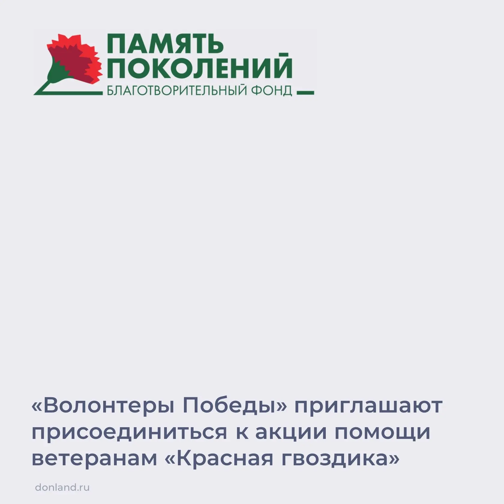 Благотворительный фонд «Память поколений» проводит акцию «Красная гвоздика». Жители России могут поддержать ветеранов ВОВ и других боевых действий, приобретая за пожертвование значок красной гвоздики. Все собранные средства фонд направит на медицинскую помощь.