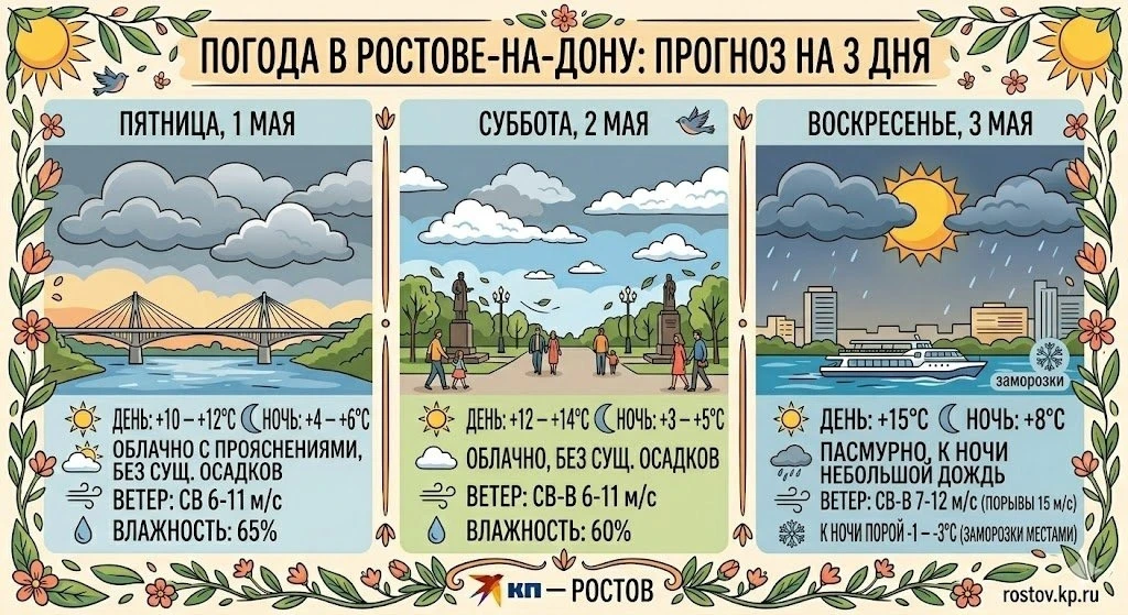 От заморозков в -3 до потепления в +16, дожди и ветер: какой будет погода в Ростовской области в праздничные выходные 1 — 3 мая