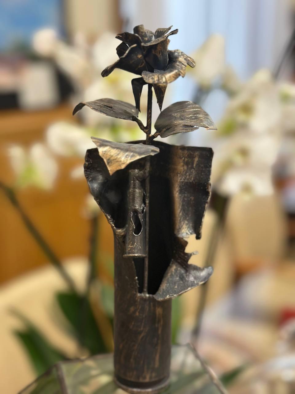 Особенно тронула история Леры из Донецка. Она принесла с собой «Розу Донбасса» – кованый цветок, созданный из гильз и осколков снарядов, которыми преступный киевский режим регулярно обстреливает мирные города Новороссии, передав её в дар МИД России.