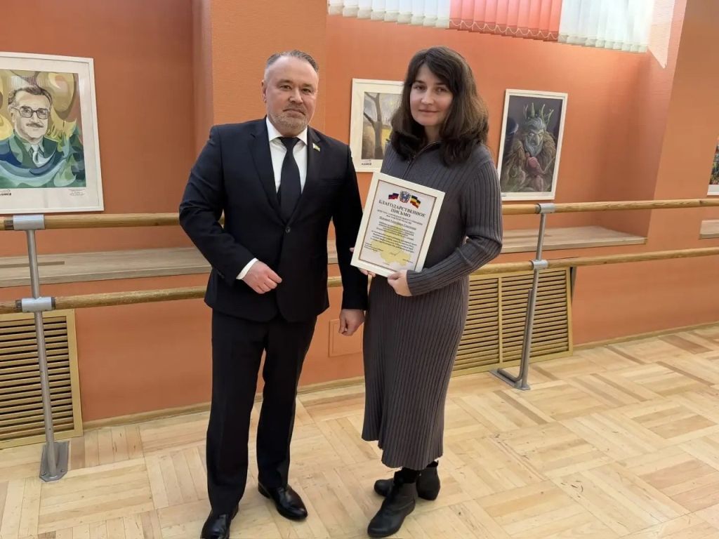 Парламентарий от имени Председателя Законодательного Собрания Ростовской области Александра ИЩЕНКО вручил благодарственные письма директору школы, заслуженному деятелю Всероссийского музыкального общества Игорю Надолинскому.