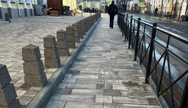 Рабочие заменили старое плиточное покрытие на площади 640 кв. м, установили новые водоотводные лотки. Для слабовидящих пешеходов у переулка Семашко уложили тактильную плитку.