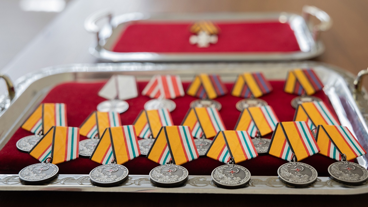 Замглавы российского военного ведомства вручил госнаграды Российской Федерации и медали Министерства обороны РФ военнослужащим, проявившим мужество, отвагу и самоотверженность при исполнении воинского долга, а также за выполнение задач в боевых условиях, сопряженных с риском для жизни. В их числе орден Мужества, медали «За отвагу», «За храбрость», «Жукова» и «За боевые отличия».