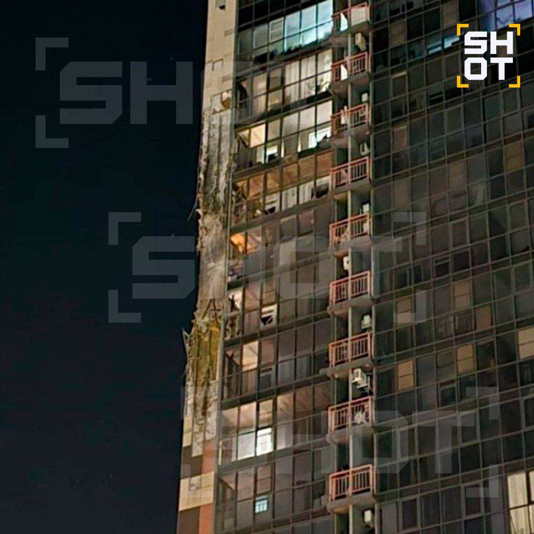 Как рассказали SHOT жители, повреждена обшивка здания, выбиты десятки сткол на верхних этажах, есть выпавшие оконные рамы. Официальной информации пока не было.