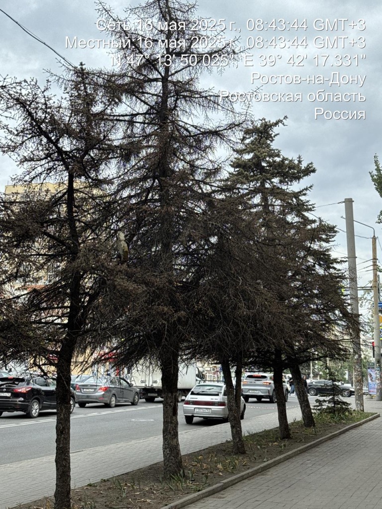 Опубликованная в соцсетях информация о вырубке здоровых елей на пр. Буденновском, 70 в Ростове не соответствует действительности. По данным администрации Октябрьского района, в публикациях используется фотография 2021 года. Тогда как по состоянию на май 2025 года хвойники были уже засохшими и выглядели так:
