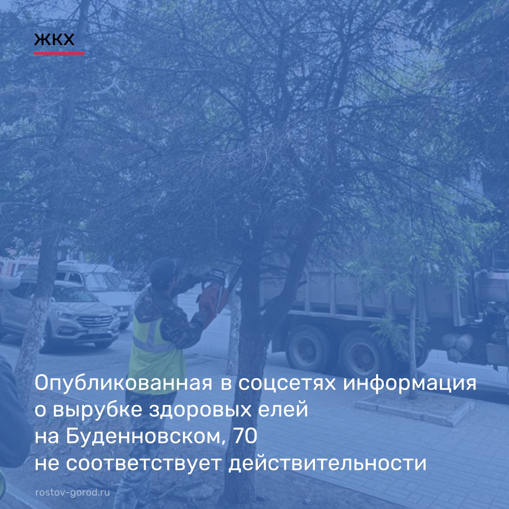 Опубликованная в соцсетях информация о вырубке здоровых елей на пр. Буденновском, 70 в Ростове не соответствует действительности.