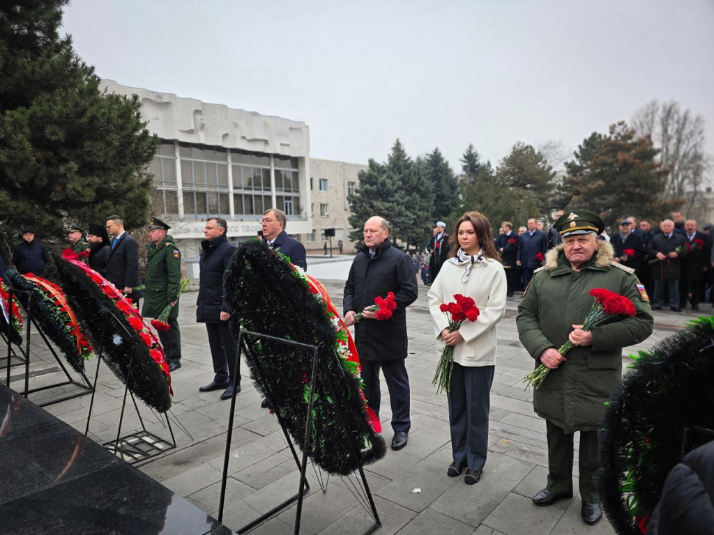 У Вечного огня мемориального комплекса «Воинам-освободителям города Ростова-на-Дону от немецко-фашистских захватчиков» на Театральной площади в церемонии возложения приняли участие депутаты Валерий Левченко, Анна Илюхина, Михаил Дирацуян, Геворк Григорян.