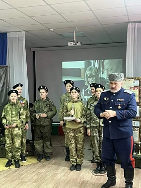 С выпускником, участником СВО, военнослужащим медицинской роты 102-го полка 150-ой гвардейской мотострелковой дивизии старшим сержантом Сергеем Николаевичем Ужакиным в рамках проекта «Время выбрало нас» встретились не только местные педагоги и школьники, но и почетные гости — представители администрации, казачества и волонтерского сообщества Родионово-Несветайского района.