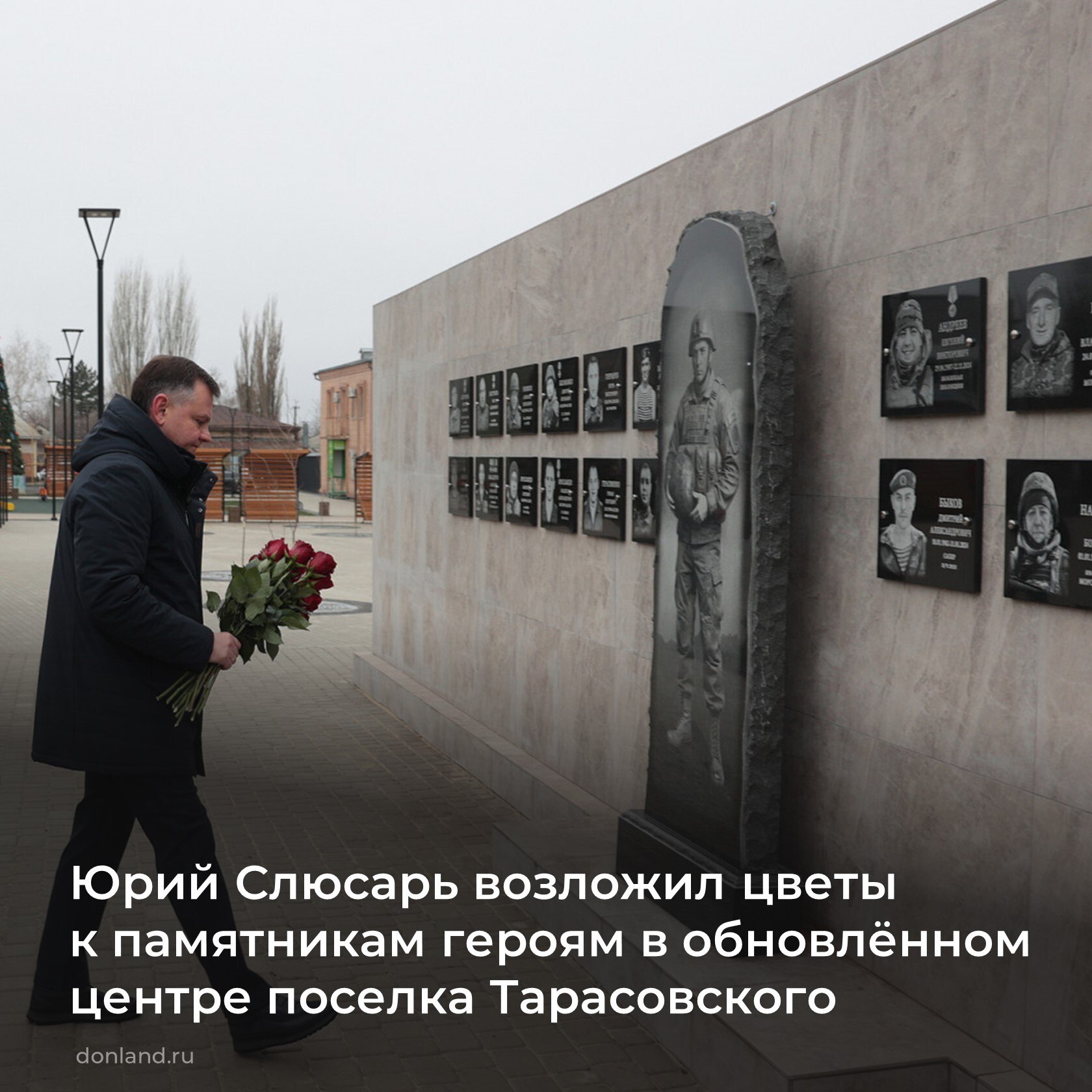 Губернатор Ростовской области Юрий Слюсарь в ходе рабочей поездки в Тарасовский район посетил центральную площадь и возложил цветы к «Стене памяти героев СВО» и монументу «Рубеж воинской доблести».