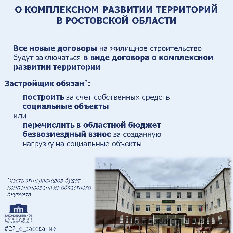 Депутаты приняли областной закон, который возлагает на застройщиков обязанность по строительству социальных объектов в рамках комплексного развития территорий в Ростовской агломерации.