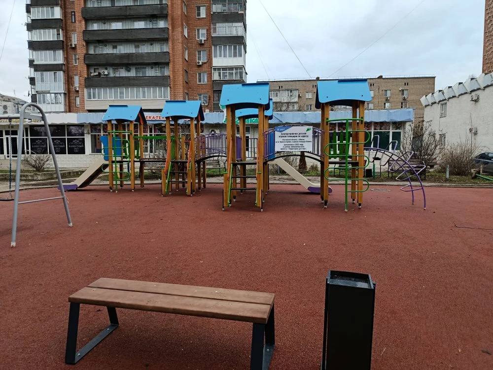 На каждой площадке установлено современное оборудование: детский игровой комплекс, двойные качели, двойные качели, карусель с рулём, удобные лавочки, урны для мусора.