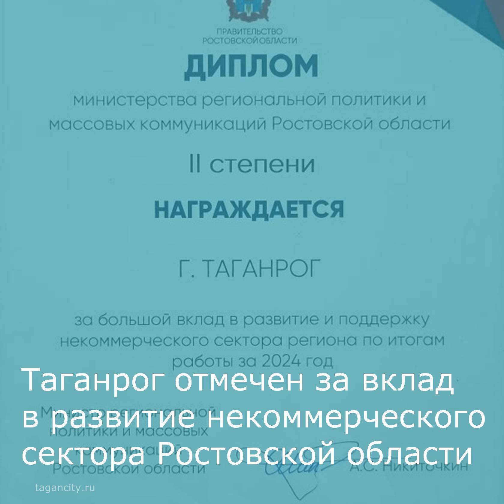 Таганрог удостоен Диплома II степени Министерства региональной политики и массовых коммуникаций Ростовской области за значительный вклад в развитие и поддержку некоммерческого сектора Ростовской области.