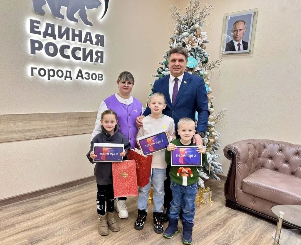 Председатель комитета донского парламента по местному самоуправлению Владимир Влазнев по поручению Председателя Законодательного Собрания Ростовской области Александра Ищенко в рамках благотворительной акции «Елка желаний» вручил новогодние подарки семье из Азова. Планшеты получили трое детей — Мирон, Анастасия и Александра.