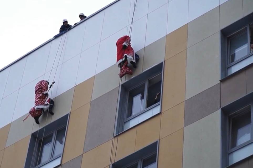 Добровольцы в костюмах главных новогодних волшебников устроили самый эффектный вход — они спустились с подарками прямиком с крыши! А Снегурочка поздравила ребят, поднявшись к окнам на настоящем пожарном подъёмнике.
