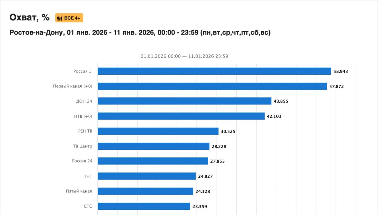 В новогодние каникулы «ДОН 24» вошёл в ТОП-3 телеканалов по охвату в Ростовской области, обойдя НТВ, и занял третью позицию сразу после «России 1» и «Первого канала».