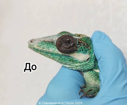 После внезапного нападения самки, с которой он мирно прожил более десяти лет, у ящерицы на глазу образовалась крупная опухоль. Ветеринар-герпетолог Анастасия Савченко установила, что глазное яблоко не повреждено, и назначила лечение без антибиотиков.