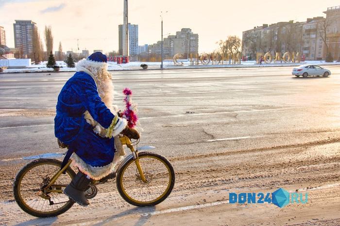 Символичной точкой, завершающей новогодние праздники, стал Дед Мороз на велосипеде на Театральной площади.