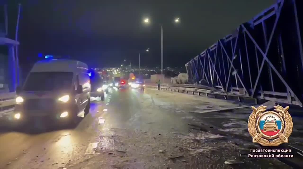 Сегодня вечером на трассе М-4 «Дон» грузовик-самосвал, двигавшийся в сторону Москвы, зацепил кузовом пешеходный мост. Из-за этого мост обрушился на проезжую часть.