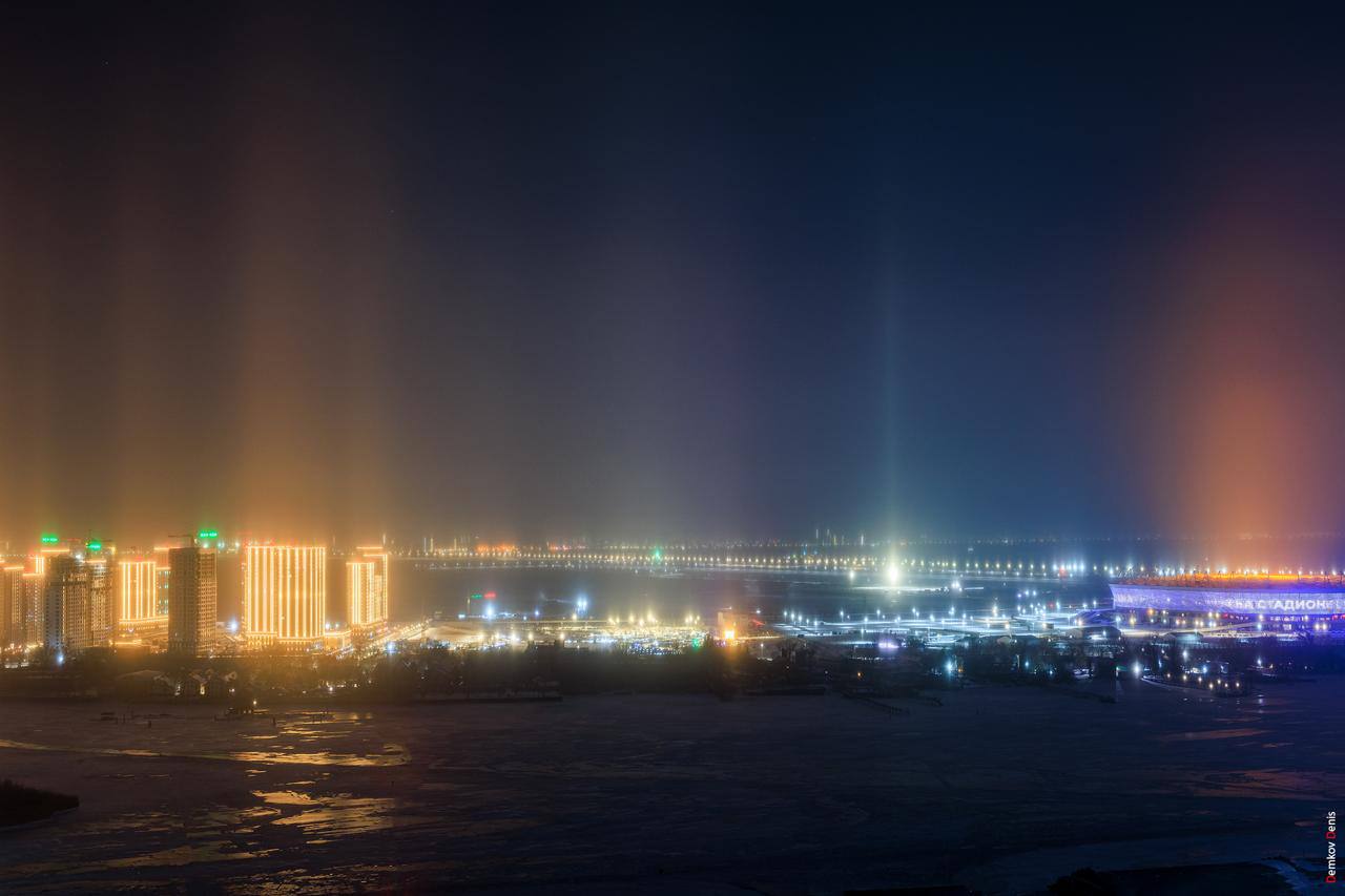 Столбы света возникают из-за мельчайших ледяных кристаллов в воздухе. В сильный холод в атмосфере образуется «алмазная пыль». Это плоские шестигранные кристаллы льда. Они отражают свет от уличных фонарей и прожекторов. Так в небе появляются вертикальные световые колонны.