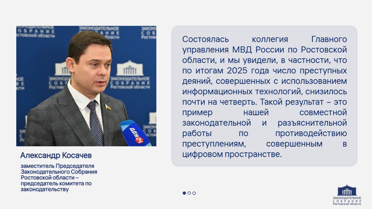 В настоящее время Законодательное Собрание готовится к обсуждению отчета о деятельности полиции за 2025 год, с которым перед депутатами выступит начальник Главного управления МВД России по Ростовской области Александр Речицкий на первом в текущем году февральском заседании донского парламента.