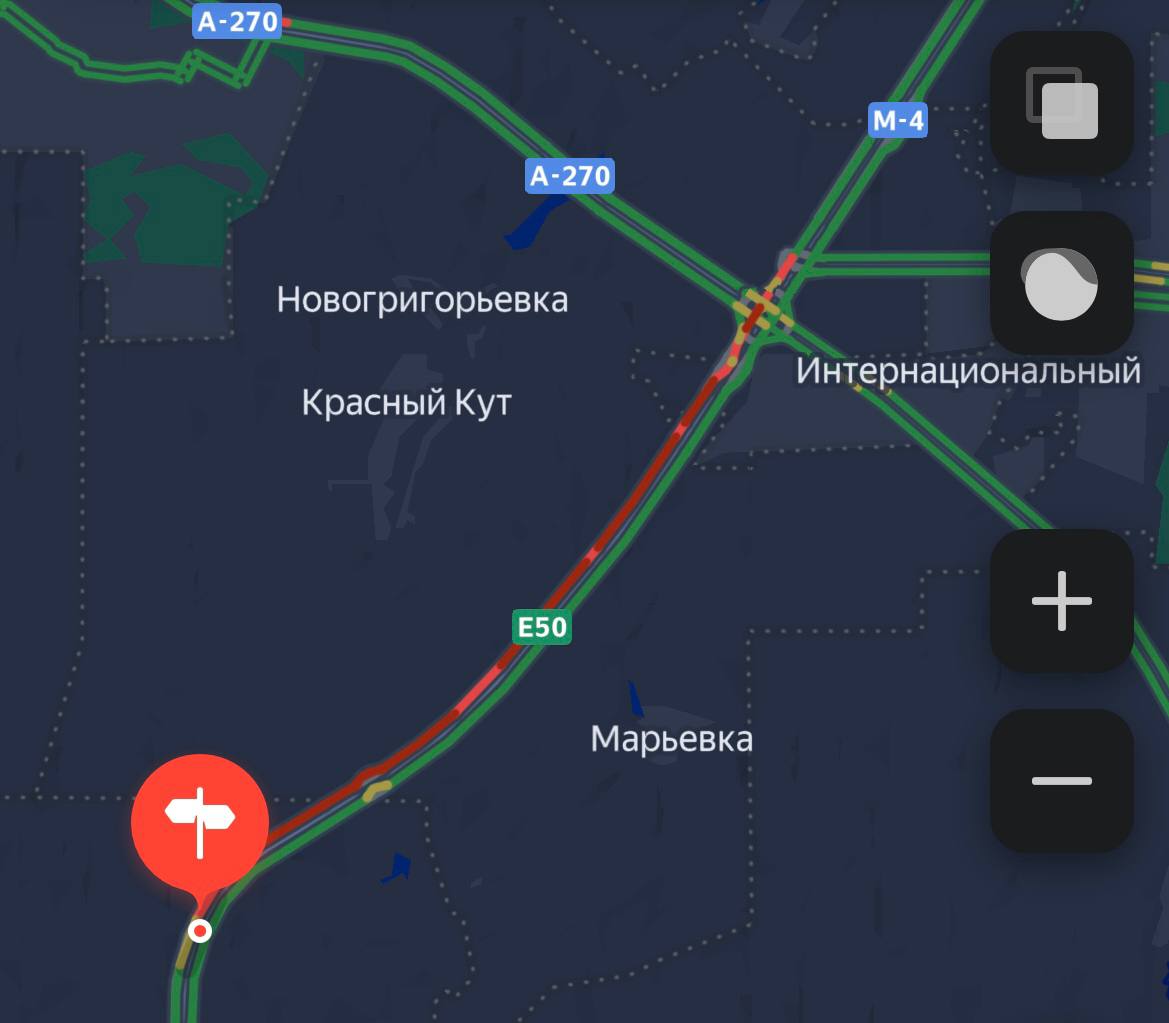 По данным сервиса «Яндекс. Карты», пробка образовалась с 1002-го по 1013-й километр. Этот участок находится в районе пересечения с трассой А-270 и тянется до хутора Сусол.