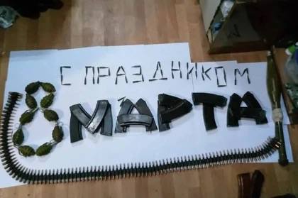 А другие парни выложили «8 Марта» из патронов и гранат и написали поздравления на снарядах.