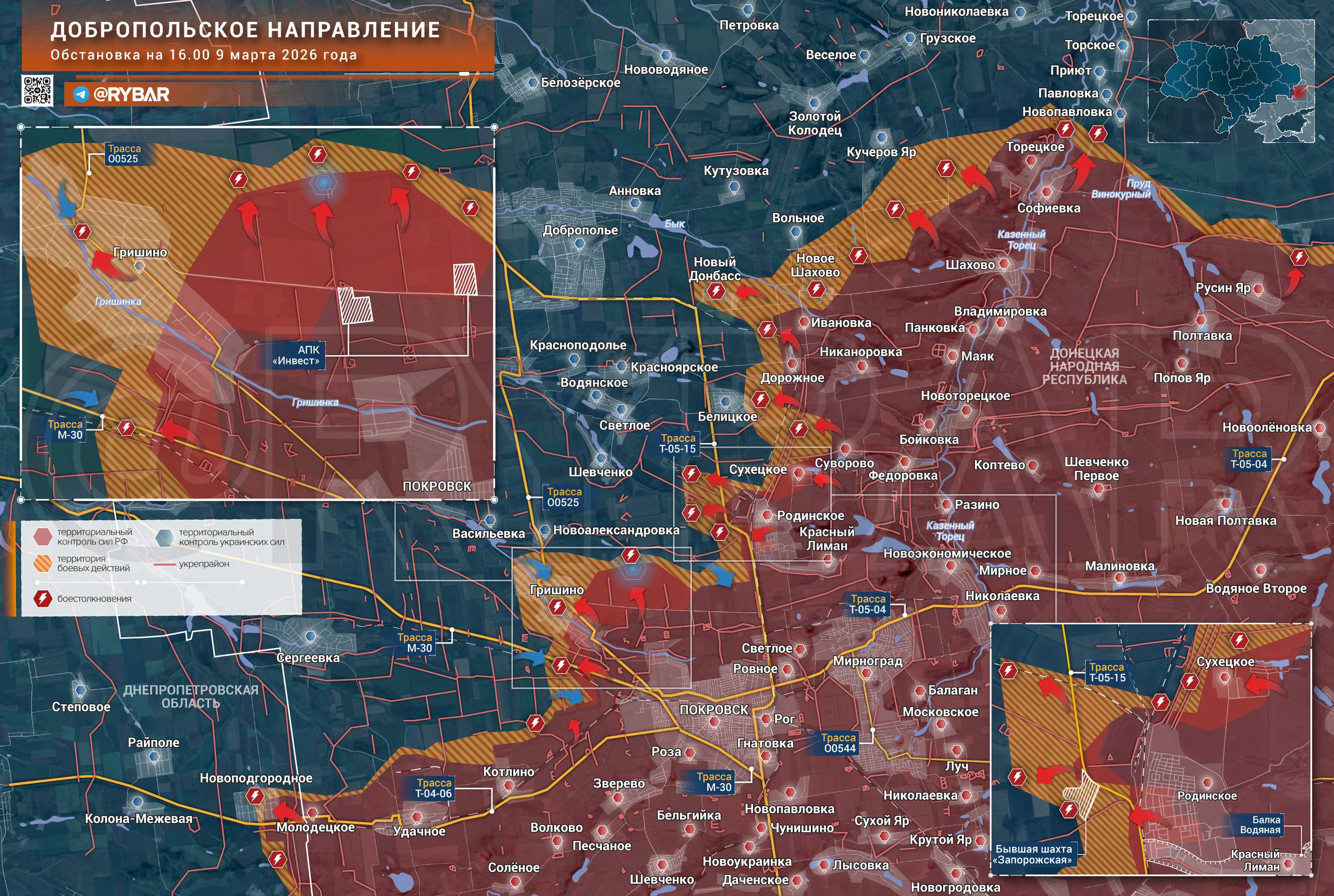 Западнее российские подразделения установили контроль над окрестностями комплекса «Инвест», таким образом обезопасив от контратак противника окраины Покровска. Также бойцы овладели опорными пунктами у трассы М-30 и расширили зону контроля в юго-восточной части Гришино. В центре населенного пункта пока что продолжаются тяжелые бои.