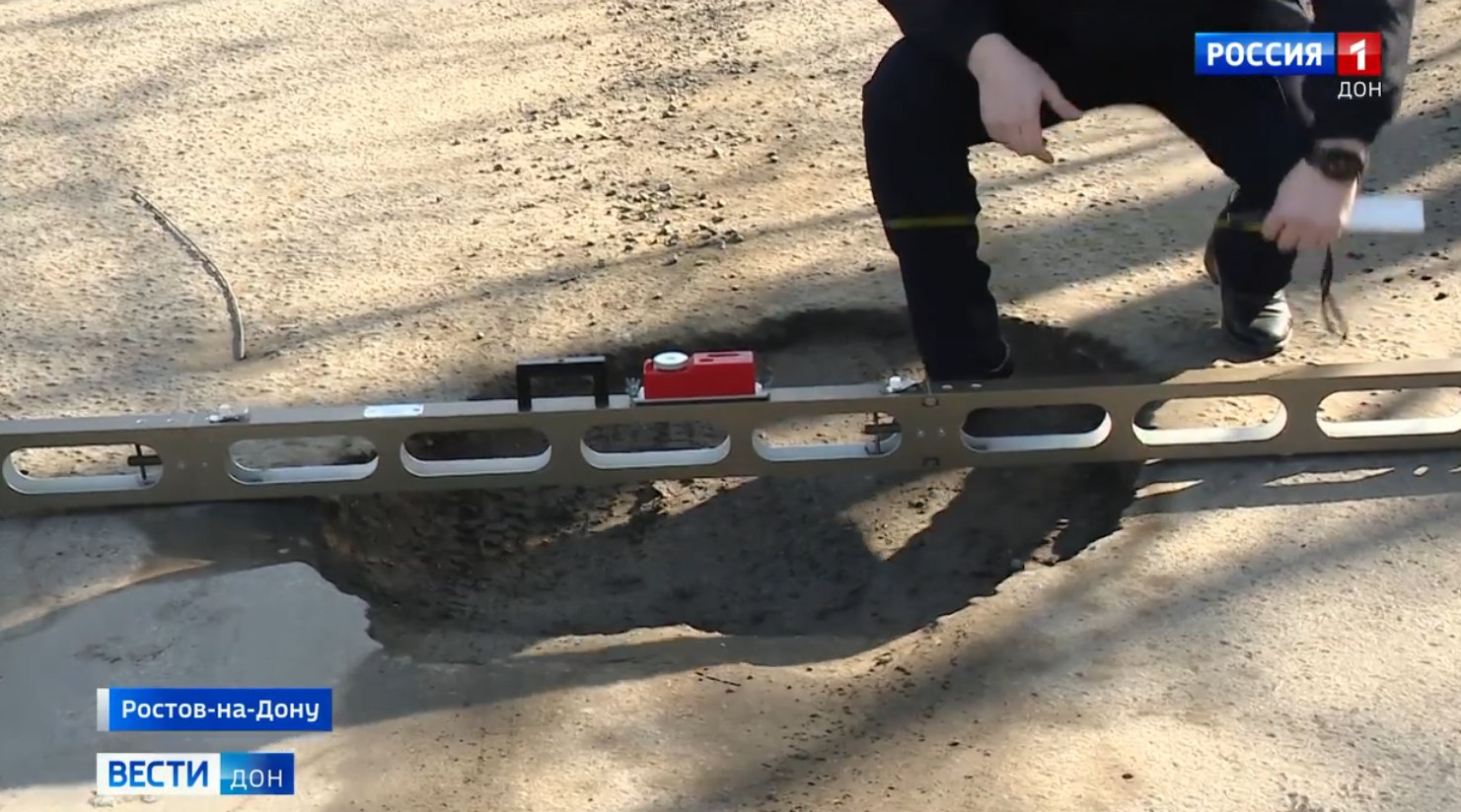 Для этого у инспекторов есть простое, но эффективное снаряжение - трехметровая дорожная рейка, которая работает по принципу обычной линейки. Измеряет длину и ширину ямы. Уровень сверху дает возможность понять наклон и глубину выбоины.