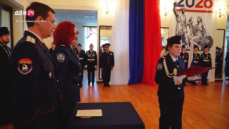 Ростовская область, 18 марта 2026. Телеканал «ДОН 24». София Соловьева делает шаг вперед, в этот день она официально примерила синюю парадную форму. Для нее и других 34 воспитанниц Мариинской гимназии это первая присяга на верность Родине и товарищам, которую дают в год поступления. В семье девушки слова «служба» и «Родина» имеют большое значение.