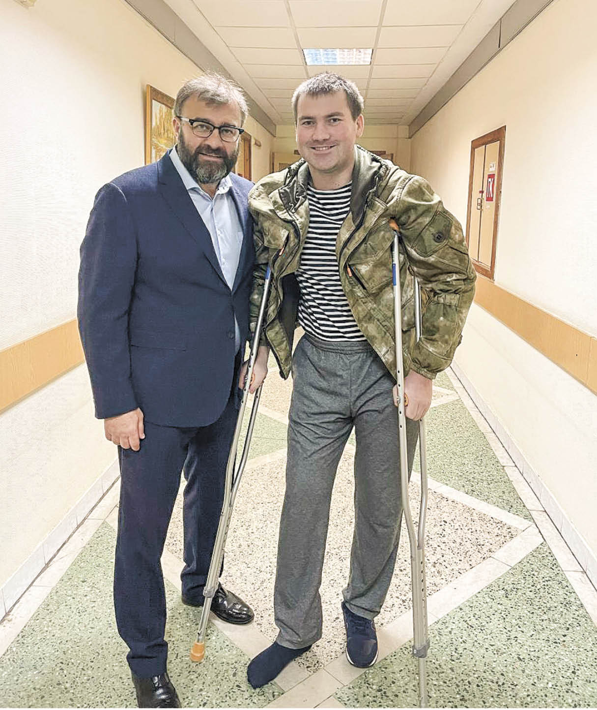 Знакомясь с фотоархивом Сергея, я увидел снимок, где он в госпитале, на костылях, но с улыбкой. Похоже, рядом с ним Михаил Пореченков.