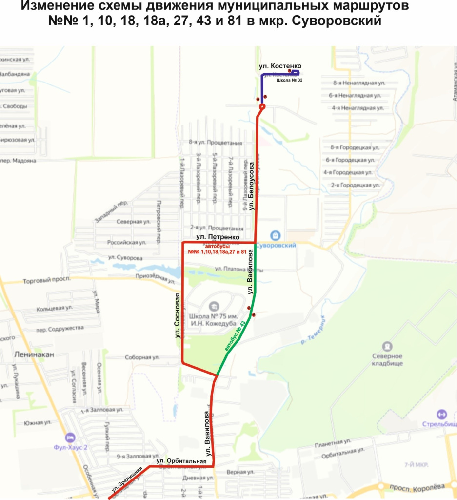 В мкр. Суворовском, в связи с обустройством отстойно-разворотной площадки и остановочных пунктов общественного транспорта по ул. Костенко, пер. Белоусова (вблизи ул. Дмитрия Петрова) и ул. Вавилова, с 28.03.2026 будут изменены схемы движения автобусов муниципальных маршрутов №№ 1, 10, 18, 18а, 27, 43 и 81 до Школы № 32, а также маршрута № 43 по ул. Вавилова от ул. Сосновая до ул. Петренко.