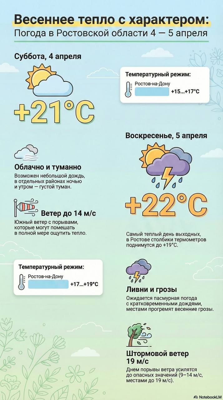 Погода в Ростовской области в выходные 4–5 апреля ожидается пасмурной, с дождями, местами — с ливнями и грозами. Но при этом столбики термометров, несмотря ни на что, потихоньку набирают высоту — воздух в отдельных районах должен прогреться до +22 градусов. Правда, из-за сильного ветра до 19 метров в секунду не всегда удастся это потепление почувствовать.